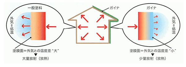 室内空気温度がいくら高くなっても、壁・天井の温度が低ければ、熱は壁・天井から逃げます。ガイナを施工すると、周辺の温度に適応し、熱の移動を最小限に抑えます。